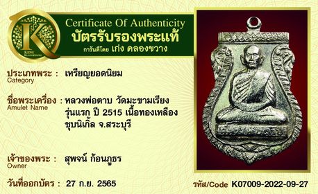 เหรียญหลวงพ่อตาบ วัดมะขามเรียง รุ่นแรก ปี 2515 เนื้อทองเหลืองชุบนิเกิ้ล จ.สระบุรี