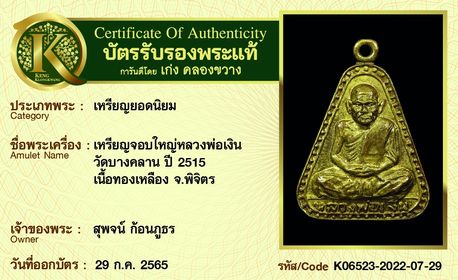 เหรียญจอบใหญ่หลวงพ่อเงิน วัดบางคลาน ปี 2515 เนื้อทองเหลือง จังหวัดพิจิตร