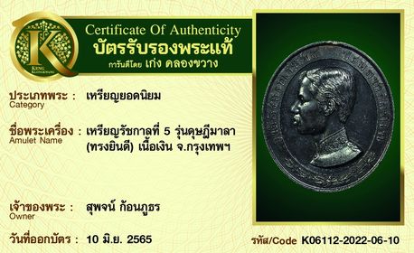เหรียญรัชกาลที่ 5 รุ่นดุษฎีมาลา (ทรงยินดี) เนื้อเงิน จังหวัดกรุงเทพฯ