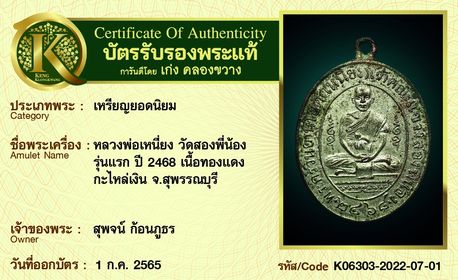 เหรียญหลวงพ่อเหนี่ยง วัดสองพี่น้อง รุ่นแรก ปี 2468 เนื้อทองแดงกะไหล่เงิน จ.สุพรรณบุรี