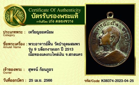เหรียญพระอาจารย์ฝั้น วัดป่าอุดมสมพร รุ่น 9 บล็อกงามเอก ปี 2513 เนื้อทองแดงกะไหล่เงิน จังหวัดสกลนคร