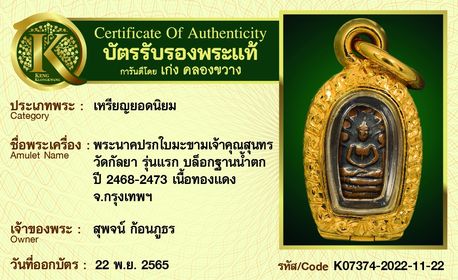 พระนาคปรกใบมะขาม เจ้าคุณสุนทร วัดกัลยา รุ่นแรก บล็อกฐานน้ำตก ปี 2468-2473 เนื้อทองแดง จ.กรุงเทพฯ