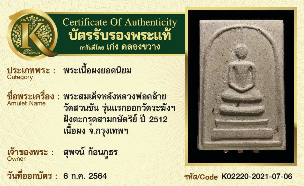 พระสมเด็จหลังหลวงพ่อคล้าย วัดสวนขัน รุ่นแรกออกวัดระฆังฯ ฝั่งตะกรุดสามกษัตริย์ ปี 2512 เนื้อผง จังหวัดกรุงเทพฯ