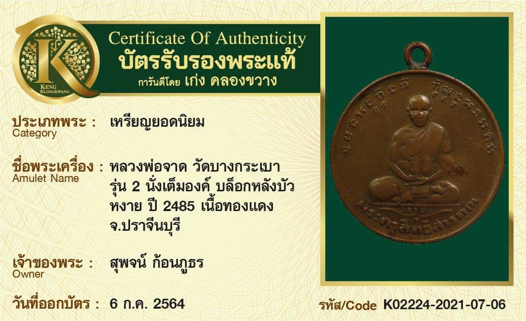 เหรียญหลวงพ่อจาด วัดบางกระเบา รุ่น 2 นั่งเต็มองค์ บล็อกหลังบัวหงาย