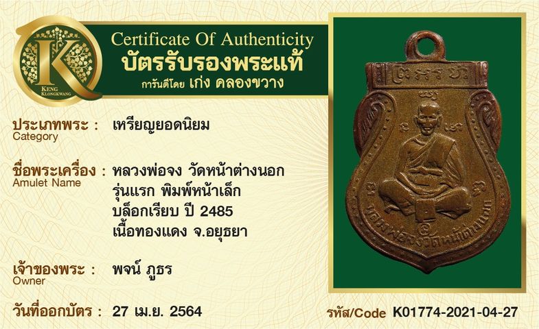 เหรียญหลวงพ่อจง วัดหน้าต่างนอก รุ่นแรก พิมพ์หน้าเล็ก บล็อกเรียบ ปี 2485 เนื้อทองแดง จังหวัดอยุธยา