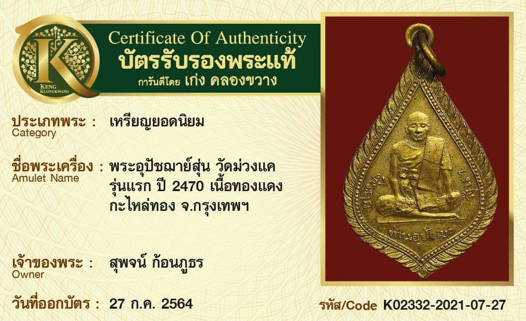เหรียญพระอุปัชฌาย์สุ่น วัดม่วงแค รุ่นแรก ปี 2470 เนื้อทองแดง กะไหล่ทอง จังหวัดกรุงเทพฯ