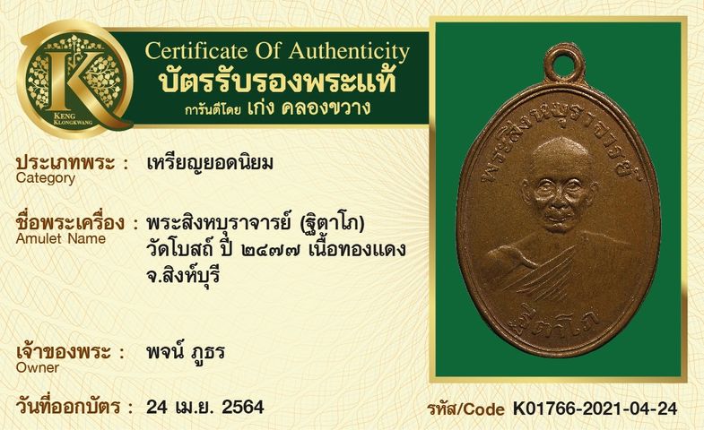 เหรียญพระสิงหบุราจารย์ (ฐิตาโภ) วัดโบสถ์ ปี 2477 เนื้อทองแดง จังหวัดสิงห์บุรี
