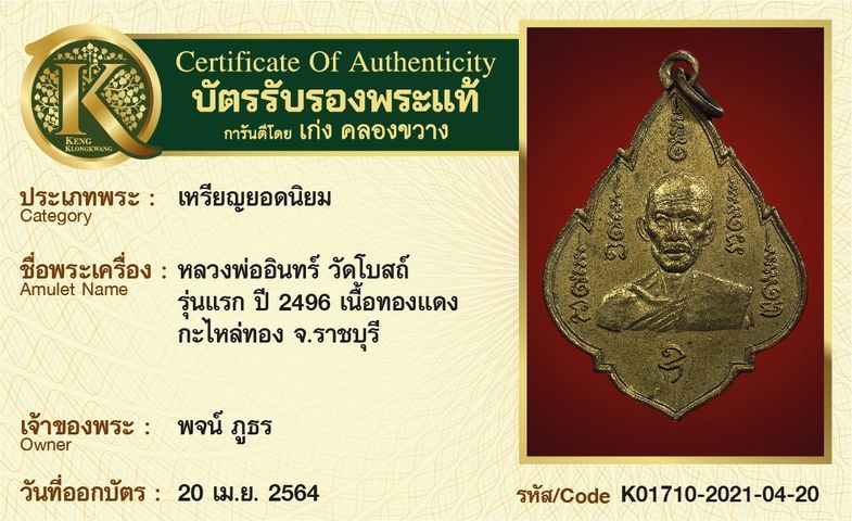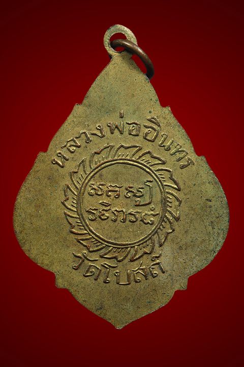 เหรียญพ่ออินทร์ วัดโบสถ์ รุ่นแรก ปี 2496 เนื้อทองแดง กะไหล่ทอง จังหวัดราชบุรี