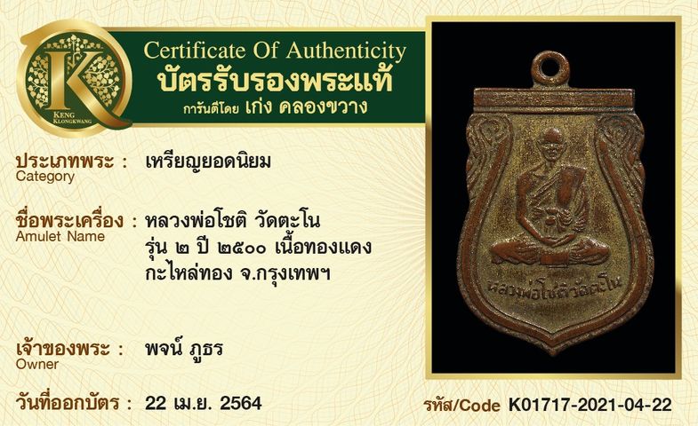 เหรียญหลวงพ่อโชติ วัดตะโน รุ่น 2 ปี 2500 เนื้อทองแดงกะไหล่ทอง จังหวัดกรุงเทพฯ