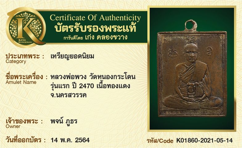 เหรียญหลวงพ่อพวง วัดหนองกระโดน รุ่นแรก ปี 2470 เนื้อทองแดง จังหวัดนครสวรรค์
