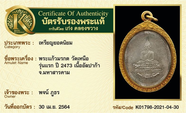 เหรียญพระแก้วมรกต วัดเหนือ รุ่นแรก ปี 2473 เนื้ออัลปาก้า จังหวัดมหาสารคาม