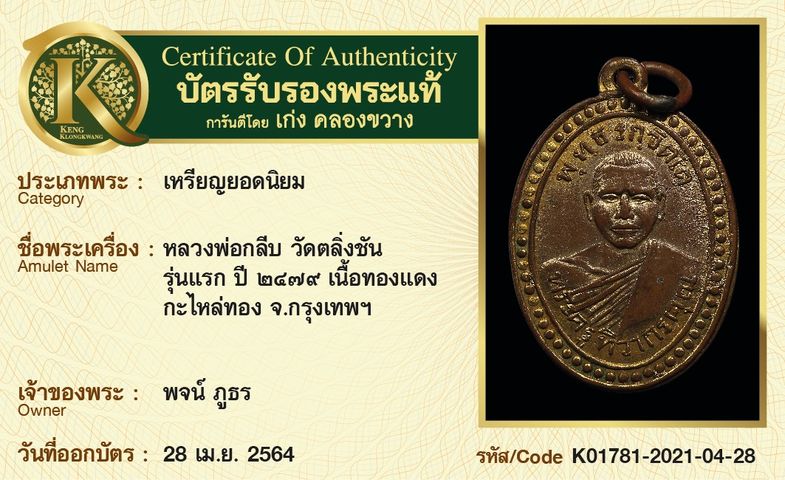 เหรียญหลวงพ่อกลีบ วัดตลิ่งชัน รุ่นแรก ปี 2479 เนื้อทองแดง กะไหล่ทอง จังหวัดกรุงเทพฯ