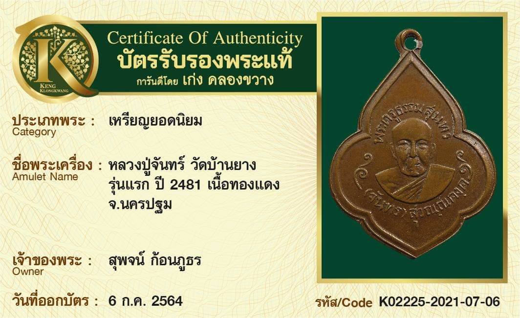 เหรียญหลวงปู่จันทร์ วัดบ้านยาง รุ่นแรก ปี 2481 เนื้อทองแดง จังหวัดนครปฐม
