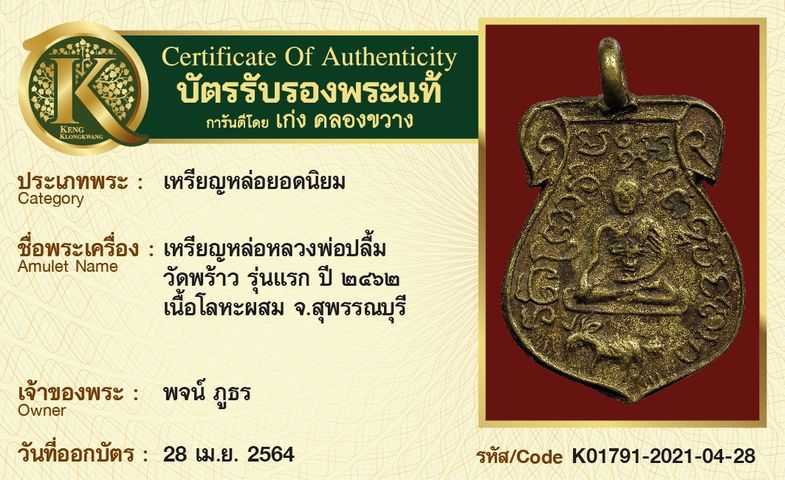 เหรียญหล่อหลวงพ่อปลื้ม วัดพร้าว รุ่นแรก ปี 2462 เนื้อโลหะผสม จังหวัดสุพรรณบุรี