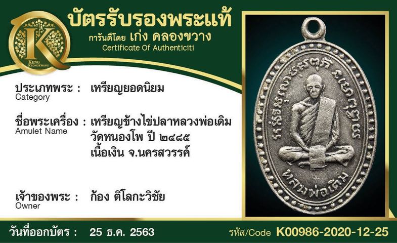 เหรียญข้างไข่ปลาหลวงพ่อเดิม วัดหนองโพ ปี 2485