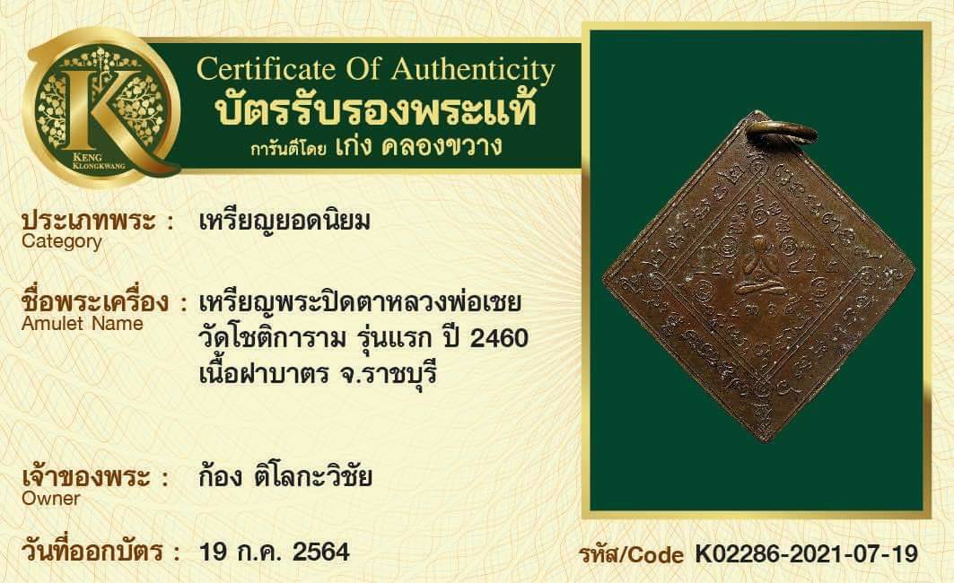 เหรียญพระปิดตาหลวงพ่อเชย วัดโชติการาม รุ่นแรก ปี 2460 เนื้อฝาบาตร จังหวัดราชบุรี