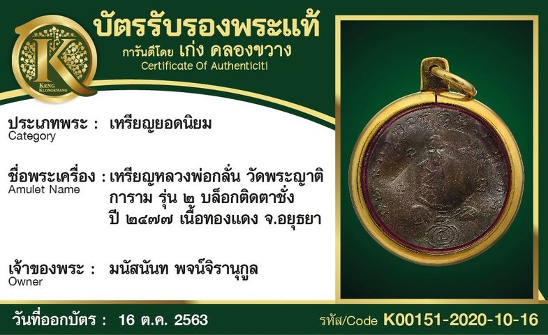 เหรียญหลวงพ่อกลั่น วัดพระญาติการาม รุ่น 2 บล็อกติดตาชั่ง ปี 2477