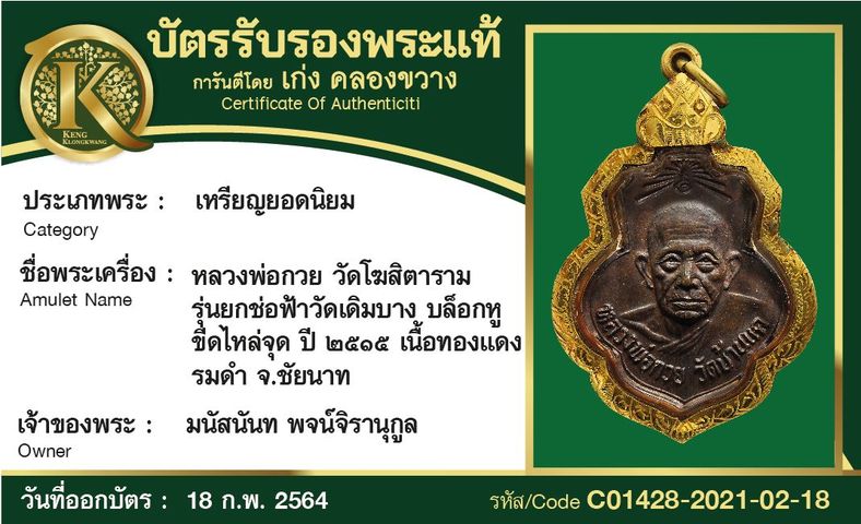 เหรียญหลวงพ่อกวย วัดโฆสิตาราม รุ่นยกช่อฟ้าวัดเดิมบาง บล็อกหูขีดไหล่จุด