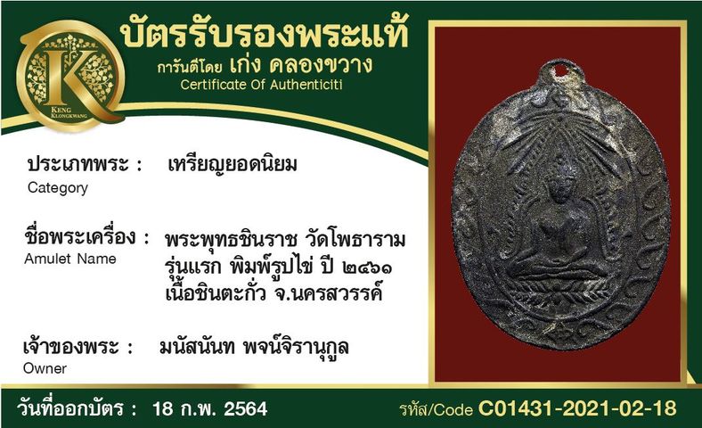 เหรียญพระพุทธชินราช วัดโพธาราม รุ่นแรก พิมพ์รูปไข่ ปี 2461