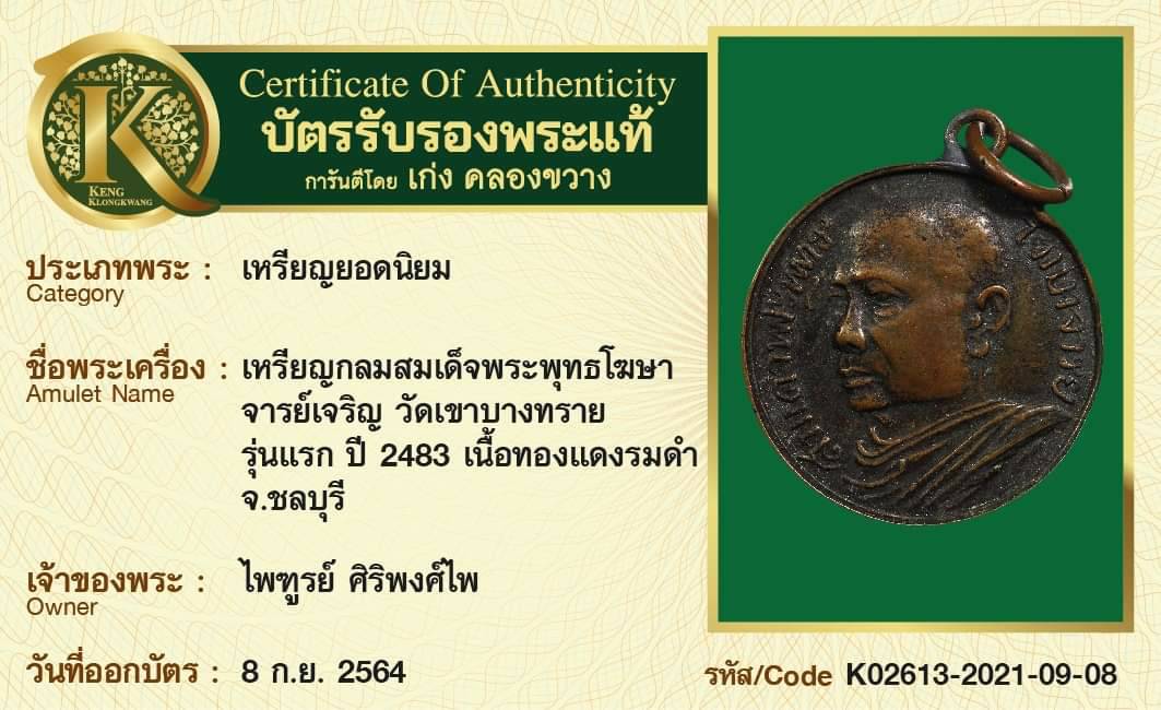 เหรียญกลมสมเด็จพระพุทธโฆษาจารย์เจริญ วัดเขาบางทราย รุ่นแรก ปี 2483 เนื้อทองแดงรมดำ