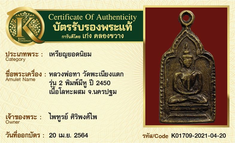 เหรียญหลวงพ่อทา วัดพะเนียงแตก รุ่น 2 พิมพ์มีหู ปี 2450 เนื้อโลหะผสม จังหวัดนครปฐม