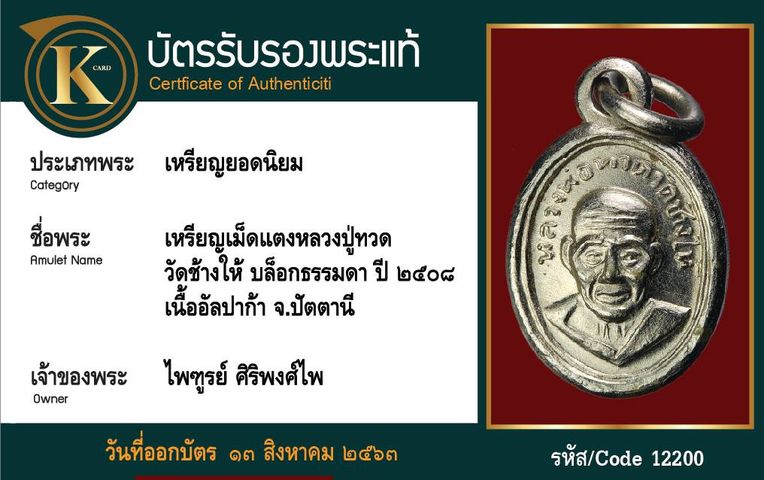 เหรียญเม็ดแตงหลวงปู่ทวด วัดช้างให้ บล็อกธรรมดา ปี 2508 เนื้ออัลปาก้า จังหวัดปัตตานี