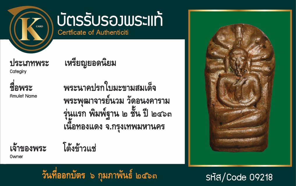 พระนาคปรกใบมะขามสมเด็จพระพุฒาจารย์นวม วัดอนงคาราม รุ่นแรก พิมพ์ฐาน 2 ชั้น ปี 2463 เนื้อทองแดง จังหวัดกรุงเทพฯ