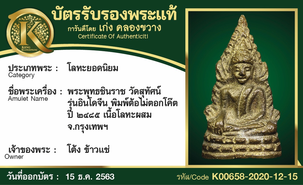 พระพุทธชินราช วัดสุทัศน์ พิมพ์ต้อไม่ตอกโค๊ต ปี 2485 เนื้อโลหะผสม จังหวัดกรุงเทพฯ