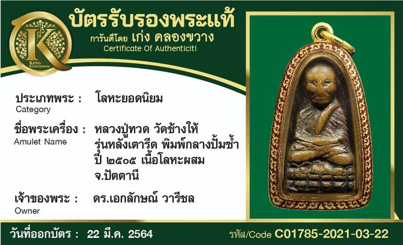 หลวงปู่ทวด วัดช้างให้ รุ่นหลังเตารีด พิมพ์กลางปั้มซ้ำ ปี 2505 เนื้อโลหะผสม จังหวัดปัตตานี