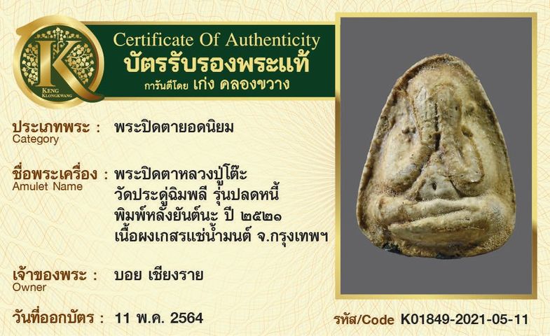 พระปิดตาหลวงปู่โต๊ะ วัดประดู่ฉิมพลี รุ่นปลดหนี้ พิมพ์หลังยันต์นะ ปี 2521 เนื้อผงเกสรแช่น้ำมนต์ จังหวัดกรุงเทพฯ