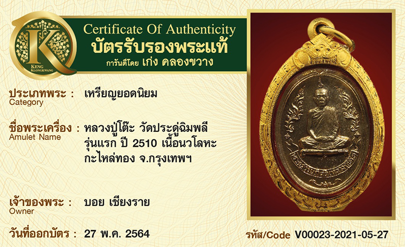 เหรียญหลวงปู่โต๊ะ วัดประดู่ฉิมพลี รุ่นแรก ปี 2510 เนื้อนวโลหะกะไหล่ทอง จังหวัดกรุงเทพฯ