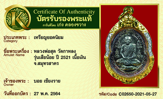 เหรียญหลวงพ่อสุด วัดกาหลง รุ่นเสือน้อย ปี 2521 เนื้อเงิน จังหวัดสมุทรสาคร