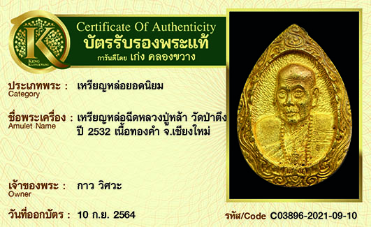 เหรียญหลวงปู่หล้า วัดป่าตึง เนื้อทองคำ