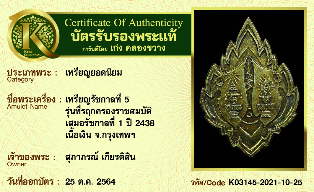 เหรียญรัชกาลที่ 5 รุ่น ที่รฤกครอบราชสมบัติ เสมอรัชกาล 3 ปี 2438 เนื้อเงิน จังหวัดกรุงเทพฯ