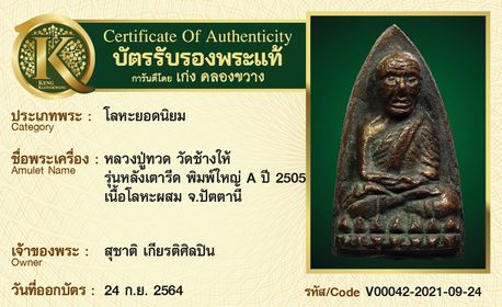 หลวงปู่ทวด วัดช้างให้ รุ่นหลังเตารีด พิมพ์ใหญ่ A ปี 2505 เนื้อโลหะผสม จังหวัดปัตตานี