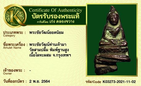 พระชัยวัฒน์ท่านเจ้ามา วัดสามปลื้ม พิมพ์ฐานสูง เนื้อโลหะผสม จังหวัดกรุงเทพฯ