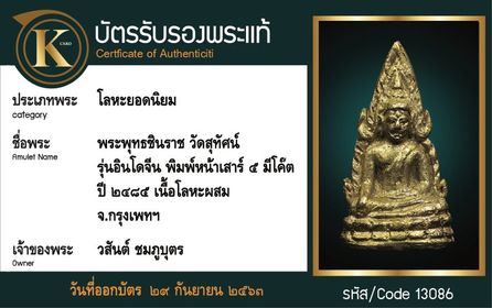 พระพุทธชินราช วัดสุทัศน์ รุ่นอินโดจีน พิมพ์หน้าเสาร์ 5 มีโค๊ต ปี 2485 เนื้อโลหะผสม จังหวัดกรุงเทพฯ