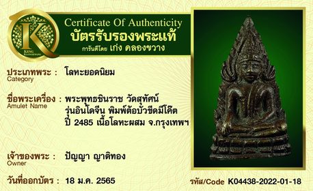 พระพุทธชินราช วัดสุทัศน์ รุ่นอินโดจีน พิมพ์ต้อบัวขีดมีโค๊ต ปี 2485 เนื้อโลหะผสม จังหวัดกรุงเทพฯ