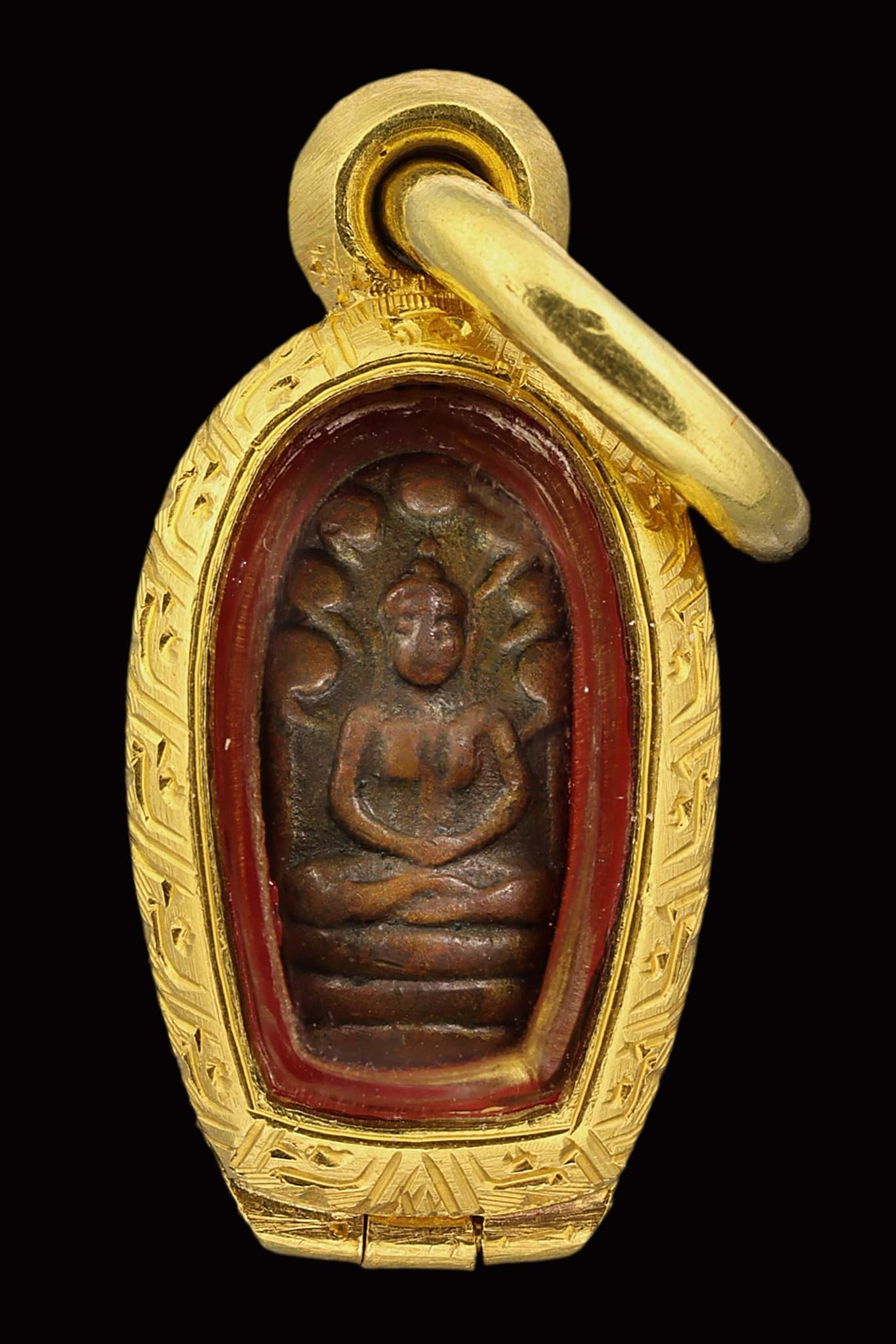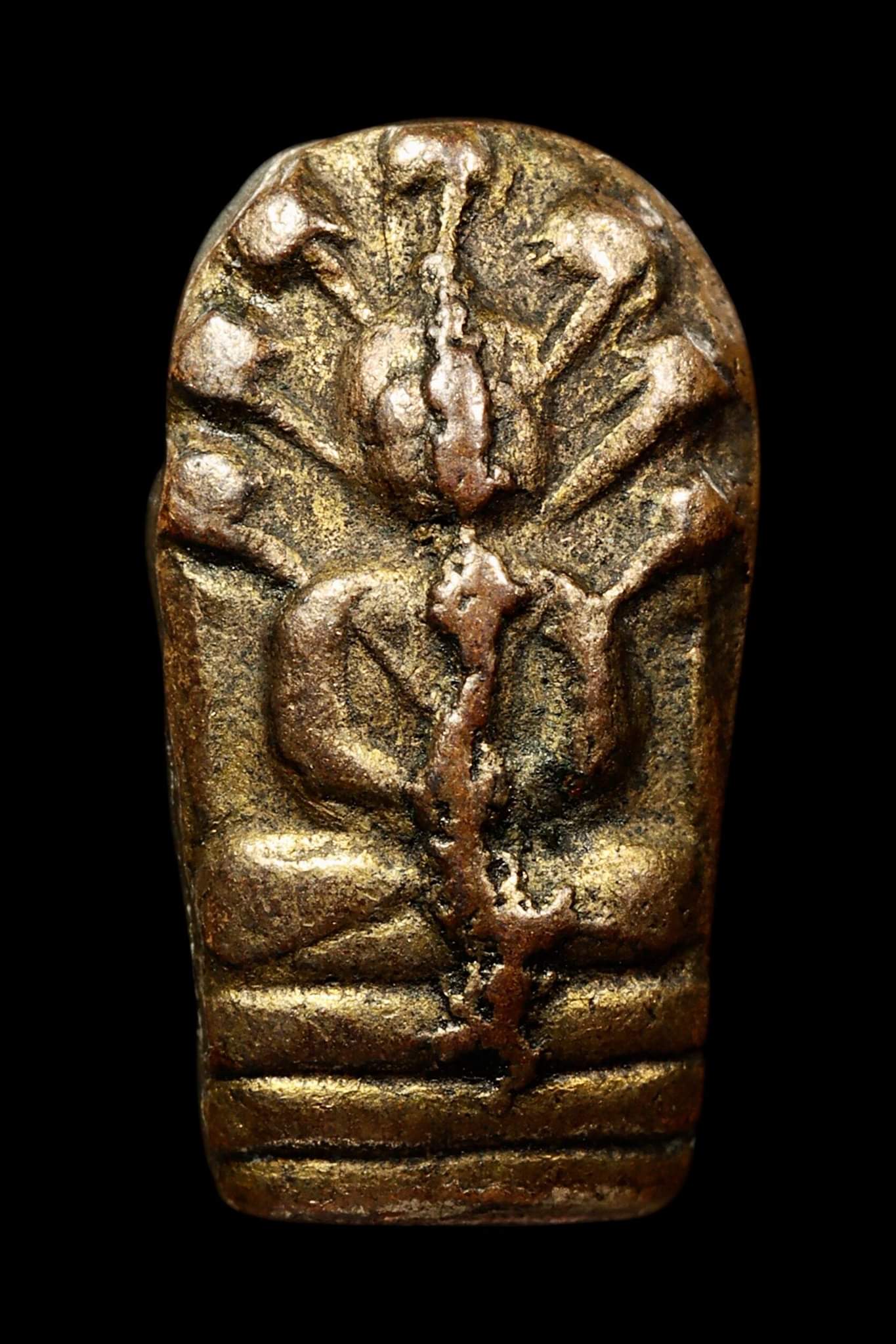 พระนาคปรกใบมะขามสมเด็จพระพุฒาจารย์ นวม พิมพ์ฐาน 3 ชั้น บล็อคแตก ปี 2463 เนื้อทองแดงกะไหล่ทอง