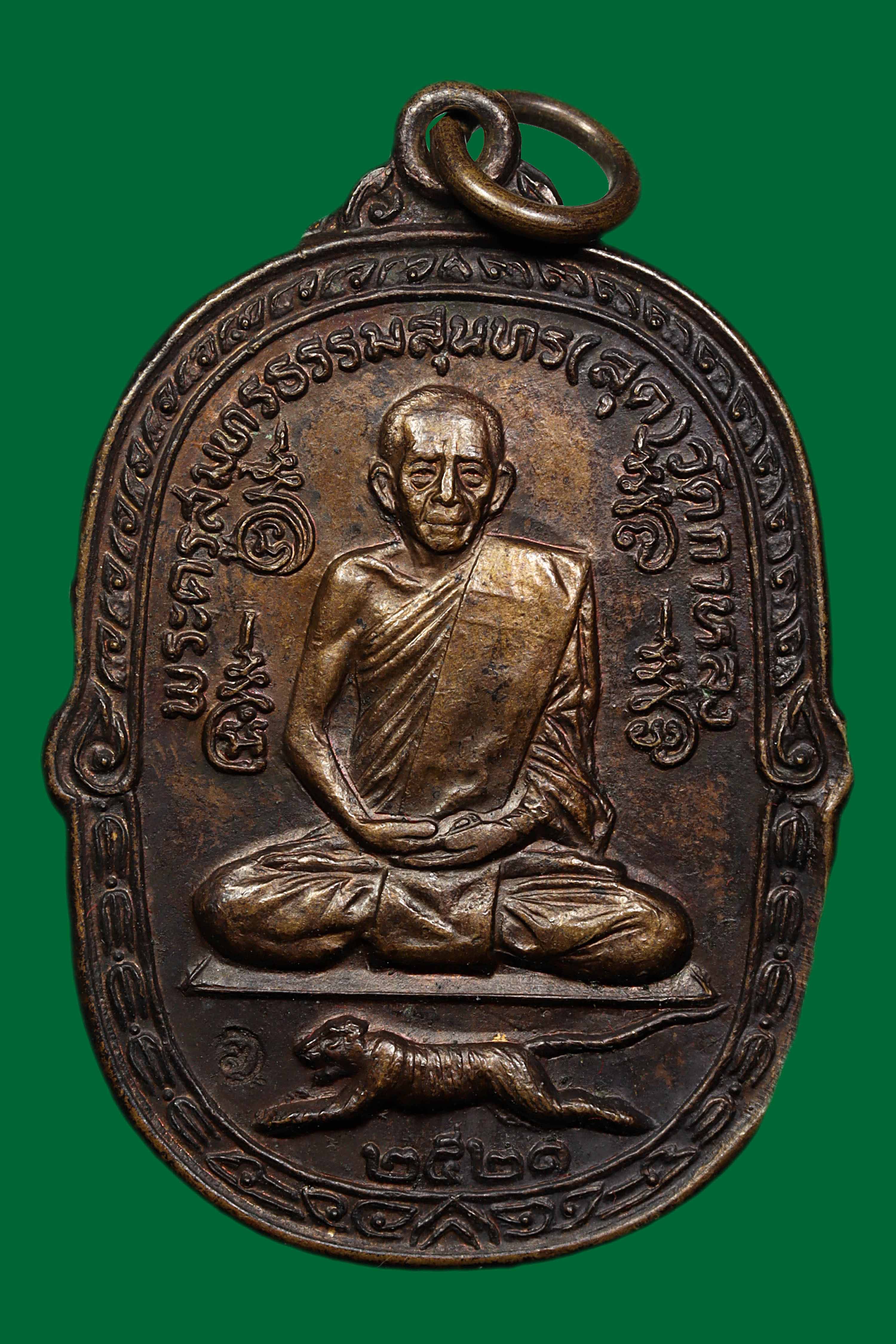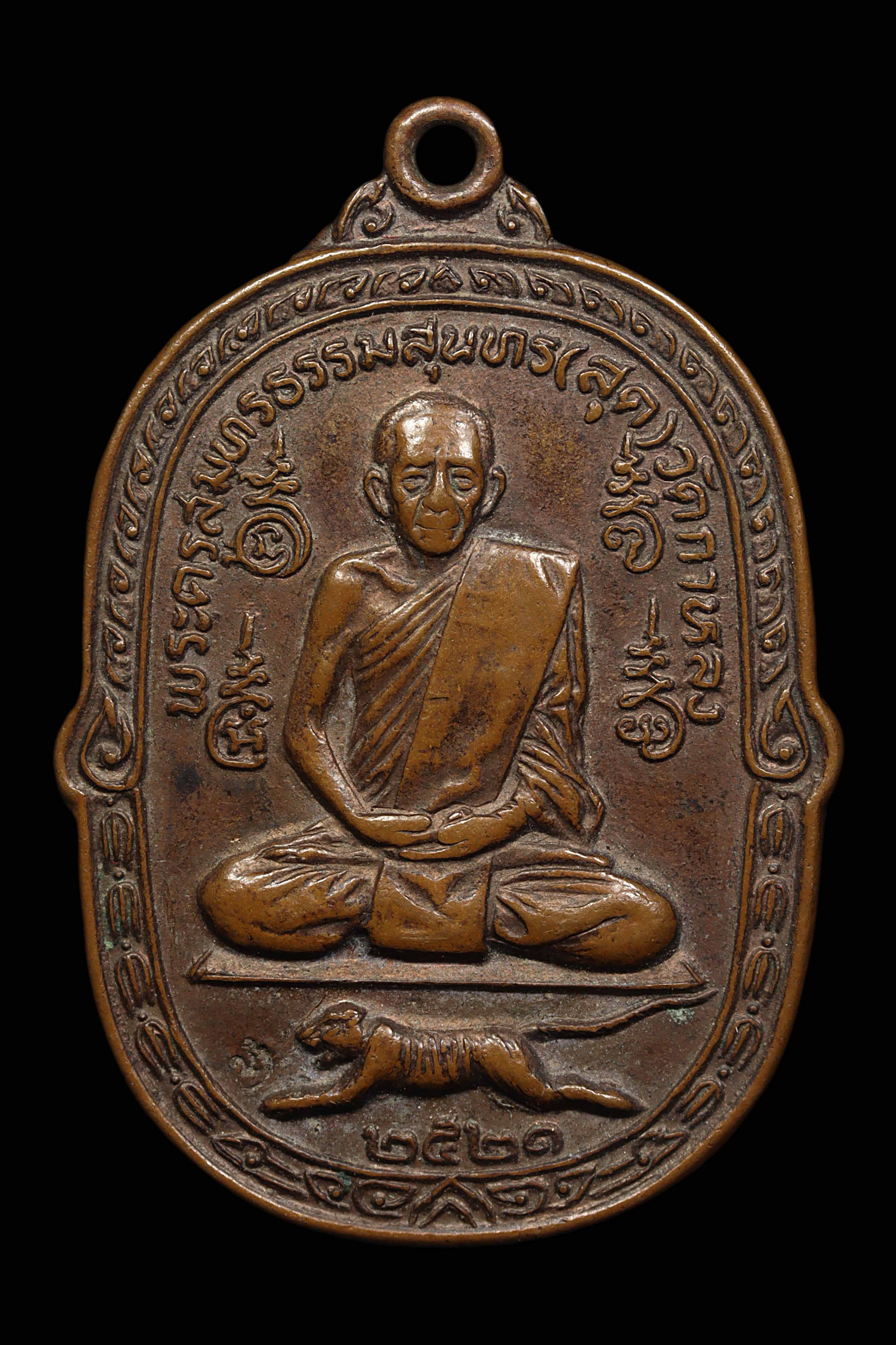 เหรียญหลวงพ่อสุด วัดกาหลง รุ่นเสือเผ่น บล็อกหางตรง ปี 2521 เนื้อทองแดงรมดำ จังหวัดสมุทรสาคร