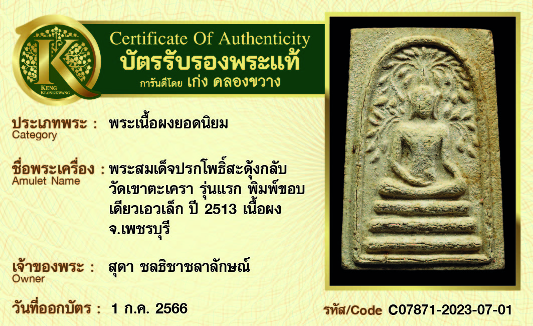 พระสมเด็จปรกโพธิ์สะดุ้งกลับ วัดเขาตะเครา รุ่นแรก พิมพ์ขอบเดียวเอวเล็ก ปี 2513 เนื้อผง จ.เพชรบุรี