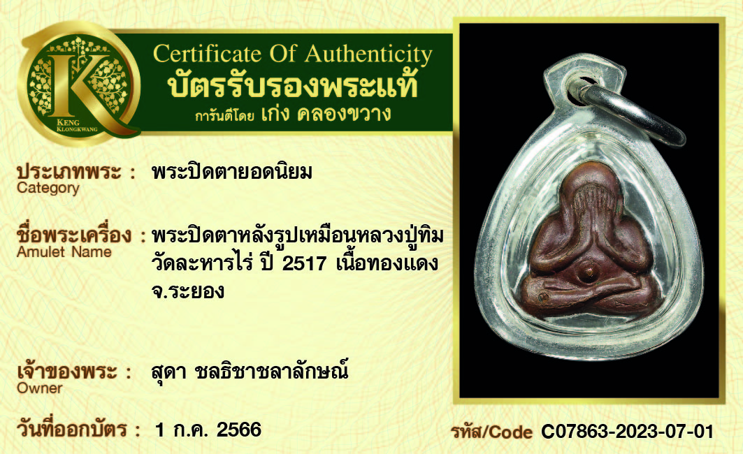 พระปิดตาหลังรูปเหมือนหลวงปู่ทิม วัดละหารไร่ ปี 2517 เนื้อทองแดง จ.ระยอง