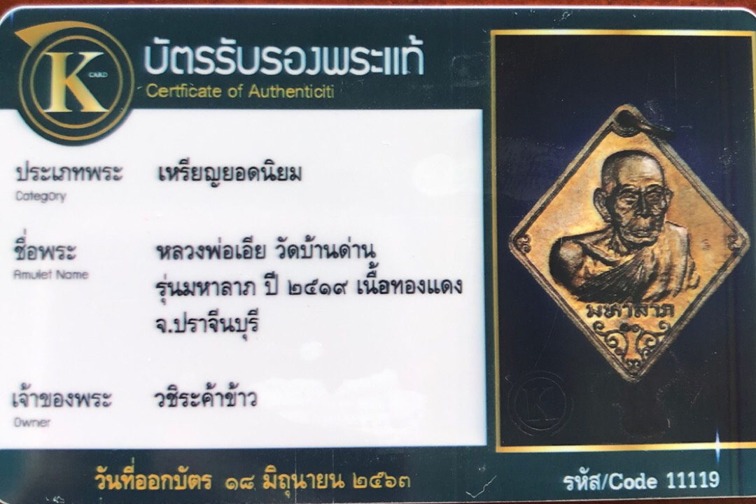 หลวงพ่อเอียวัดบ้านด่านรุ่นมหาลาภปี2519เนื้อทองแดง.จ.ปราจีนบุรี