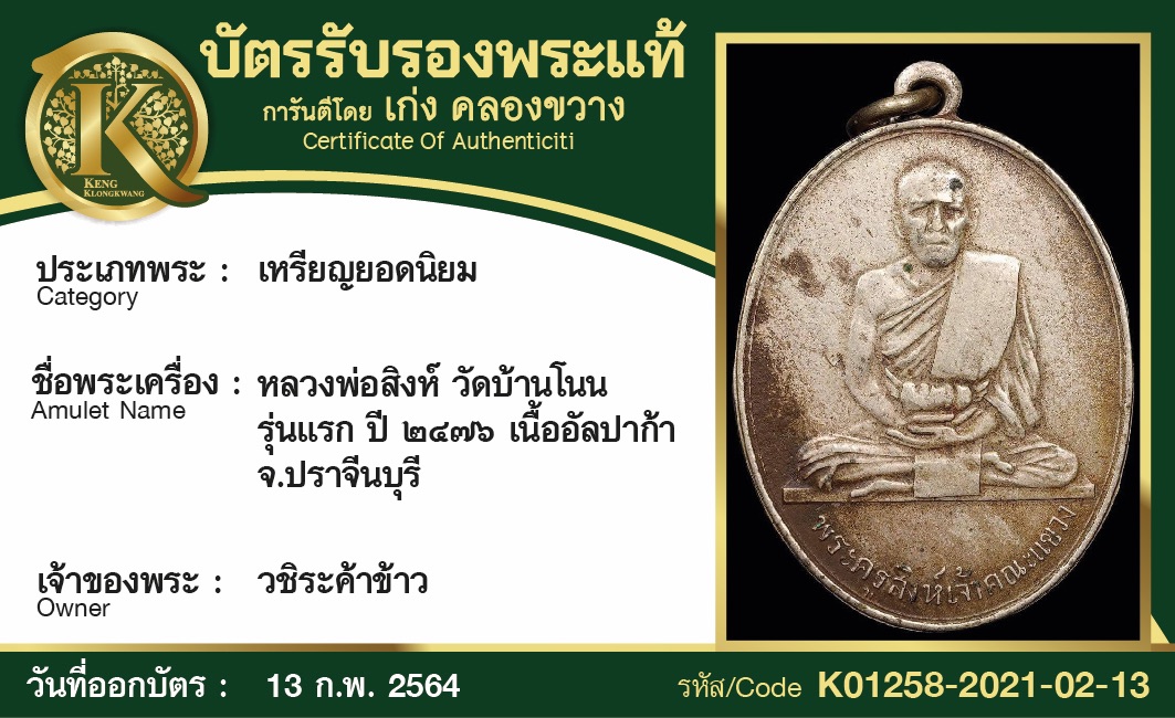 เหรียญหลวงพ่อสิงห์วัดบ้านโนนรุ่นแรกปี2476