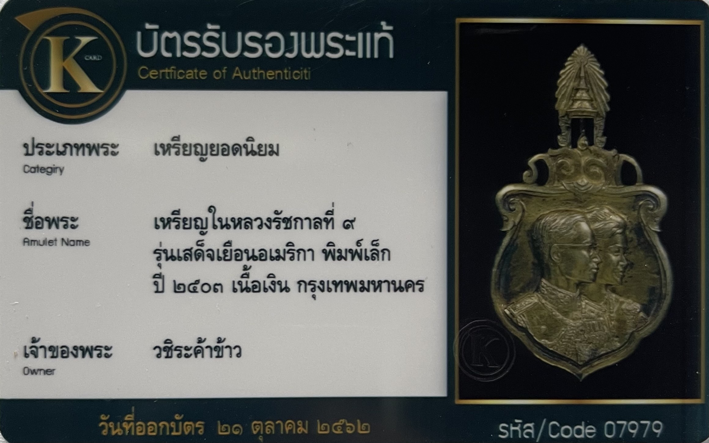 เหรียญในหลวงร.๙รุ่นเสด็จเยือนอเมริกาพิมพ์เล็กปี2503เนื้อเงิน.ก.ท.ม.