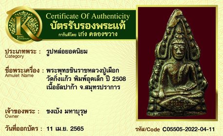 พระพุทธชินราช หลวงปู่เผือก วัดกิ่งแก้ว พิมพ์อุดเล็ก ปี 2508 เนื้ออัลปาก้า จังหวัดสมุทรปราการ