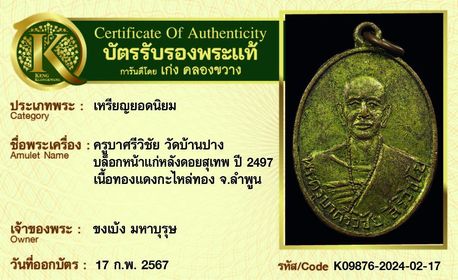 เหรียญครูบาศรีวิชัย วัดบ้านปาง บล็อกหน้าแก่หลังดอยสุเทพ ปี 2497 เนื้อทองแดงกะไหล่ทอง จ.ลำพูน