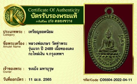 เหรียญหลวงพ่อเกษร วัดท่าพระ รุ่นแรก ปี 2489 เนื้อทองแดงกะไหล่เงิน จังหวัดกรุงเทพฯ