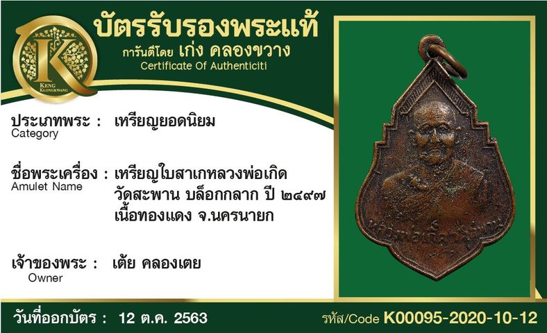 เหรียญใบสาเกหลวงพ่อเกิด วัดสะพาน บล็อกกลาก ปี 2497 เนื้อทองแดง จังหวัดนครนายก