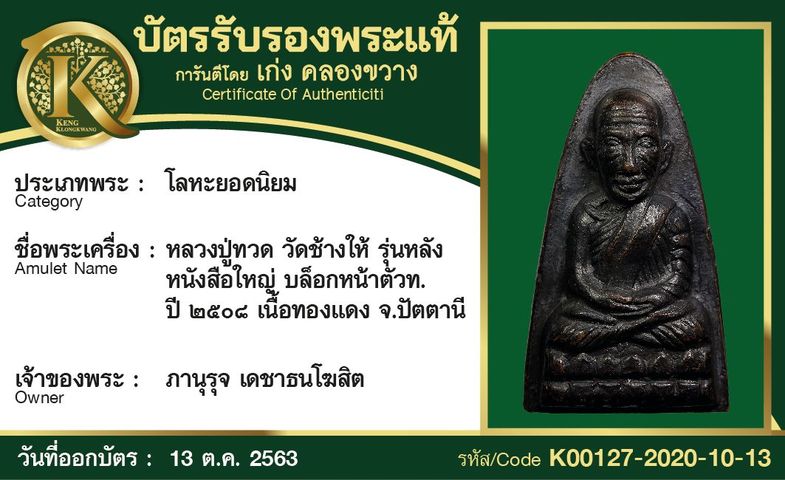 หลวงปู่ทวด วัดช้างให้ รุ่นหลังหนังสือใหญ่ บล็อหน้าตัว ท. ปี 2508 เนื้อทอง จังหวัดปัตตานี